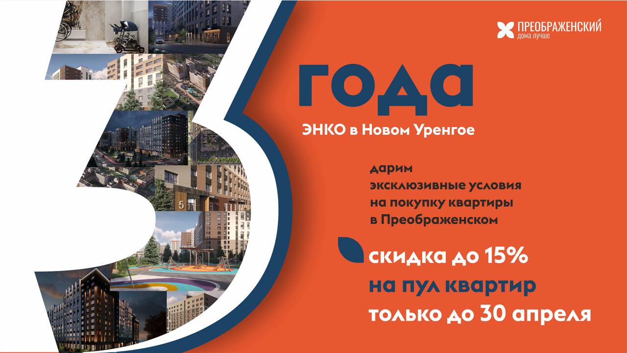 Уже 3 года как ЭНКО строит современные и уютные дома, чтобы вы могли начать новую главу вашей жизни в Новом Уренгое. И мы решили отметить это выгодным предложением для покупателей. До 30 апреля 2026 года действует скидка до 15% на квартиры в жилом комплексе Преображенский.