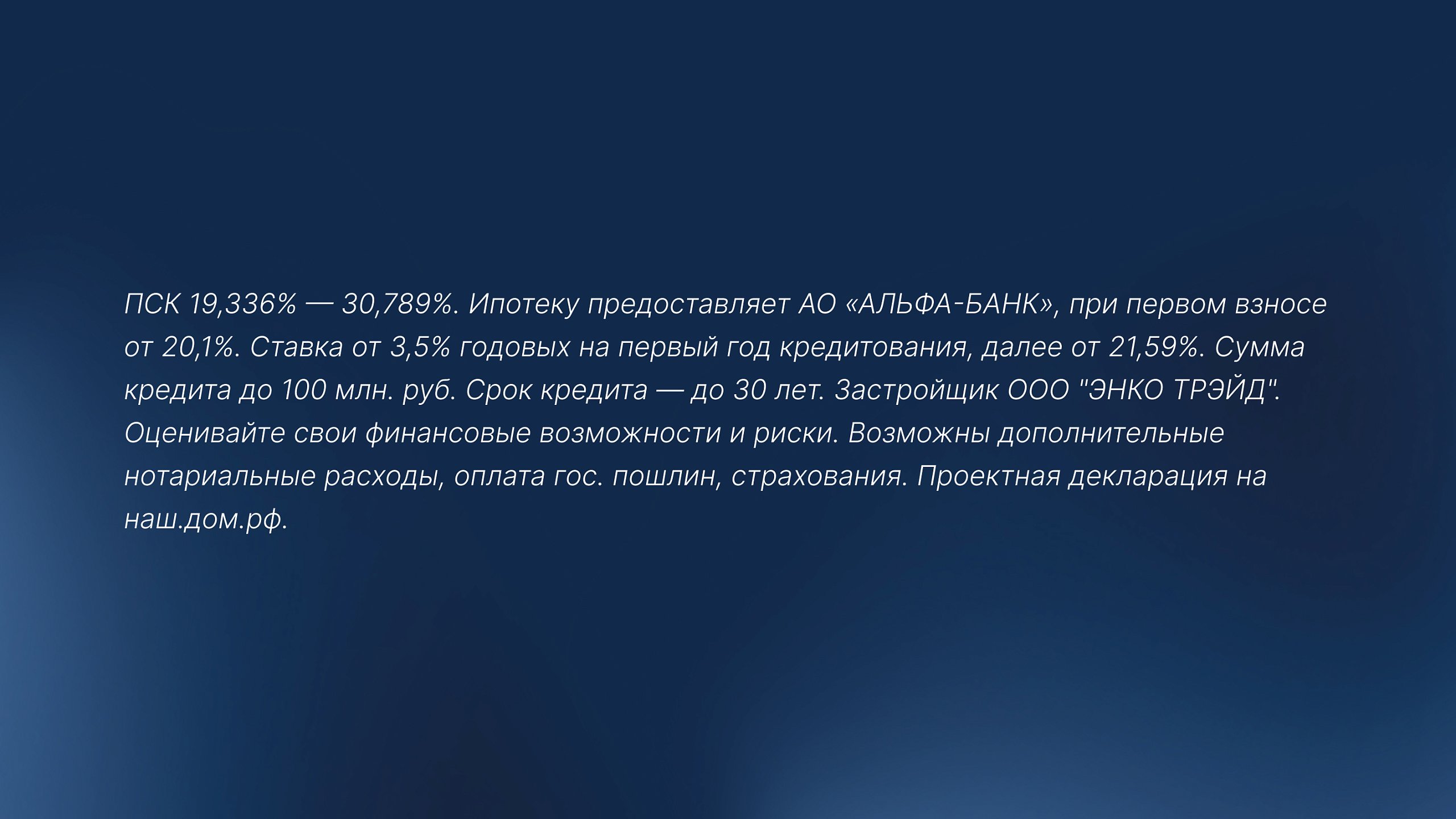 Если хочется заехать в новую квартиру без переплат, подойдет беспроцентная рассрочка с первоначальным взносом от 10%. Платеж рассчитывается исходя из выбранной планировки, минимальный ежемесячный взнос — 50 000 рублей. Прозрачно, понятно, без скрытых условий.