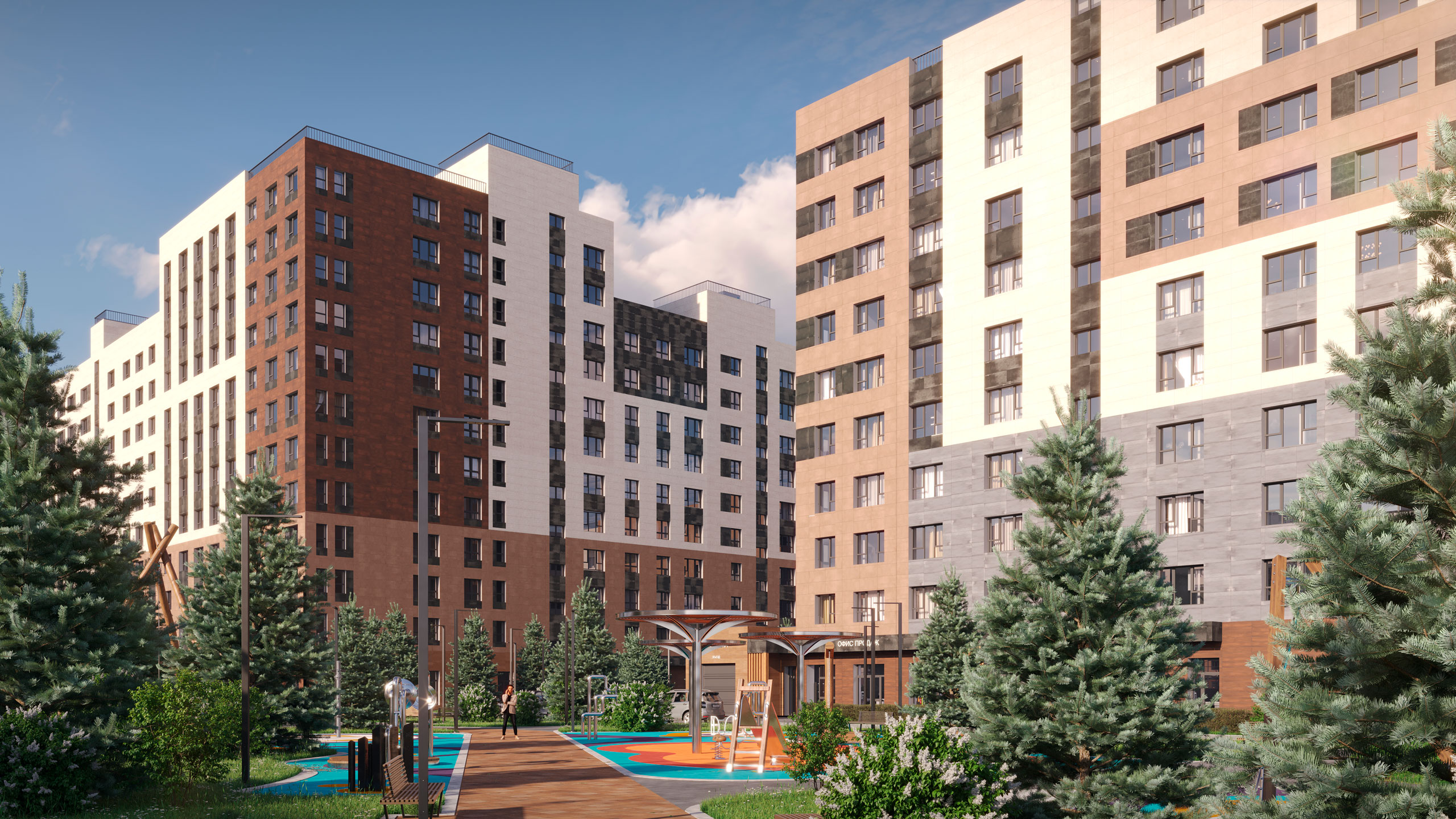 и просторные светлые холлы с дизайнерскими интерьерами. Прозрачные стеклянные тамбуры — чтобы всё легко просматривалось как снаружи, так и внутри. Входы на уровне земли — для удобства велосипедистов, родителей с колясками и маломобильных людей. Стильно, комфортно и безопасно.
